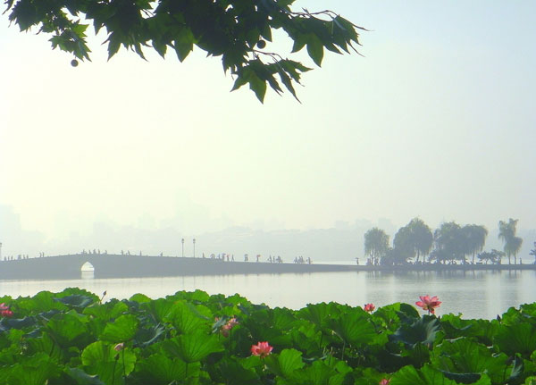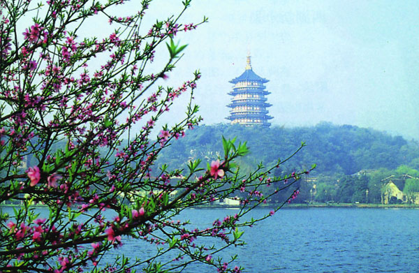 春花燦爛:西湖白堤和蘇堤的桃樹與垂柳間種,一株楊柳一株桃,樹樹桃花間柳花,產(chǎn)生了極有層次的景觀效果。在那兒觀賞桃花,確實(shí)是一件賞心悅目之事。俗話說(shuō):“桃花應(yīng)在水邊看。”盈盈碧水映桃花,花光水影,嬌艷欲滴。“夾岸桃花蘸水開”,就如臨水梳妝的美人,楚楚動(dòng)人,令人心醉。