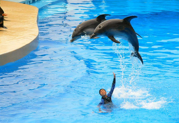 游玩海洋公園的重頭戲——海洋劇場,這里每天都為游客提供數(shù)場精采絕倫、有趣可愛的海豚和海獅表演,表演的節(jié)目內(nèi)容很多,兩只海獅招手、倒立、揮手、拿救生圈救人、對“落水者”進行人工呼吸……五只海豚則表演游泳比賽、跳高觸球、跨籃、空中翻身36周半、直立旋轉(zhuǎn)、仰泳等,非常有靈性。特別是那些團體動作,也能做得整齊劃一,有板有眼。