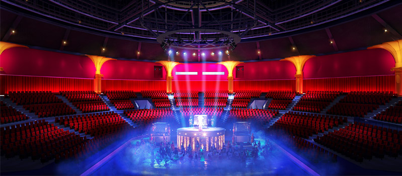 走進馬戲劇院內(nèi)部,其炫彩奪目的主舞臺背景是一個巨大的面具造型,場上的馬圈按世界標準的馬戲場建設,最外圍的一圈直徑17米,內(nèi)圈直徑13米。舞臺上具有獨特的升降臺有別于其他馬戲館,可容納30個人的樂隊在高空現(xiàn)場伴奏,不僅不影響演員的表演,而且現(xiàn)場的伴奏能給觀眾帶來更華麗更震撼的視聽享受,也為馬戲表演加分不少。